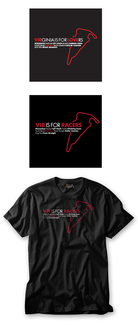 Design for Virginia International Raceway promotional t-shirt "VIRGINIA IS FOR TRACK LOVERS" contest by blipshift.com. The original design "VIRGINIA IS FOR LOVERS" was the winning entry. The design was modified to "VIRGINIA IS FOR RACERS" in order to comply with the Virginia Tourism Board and was the final design that was produced and sold.